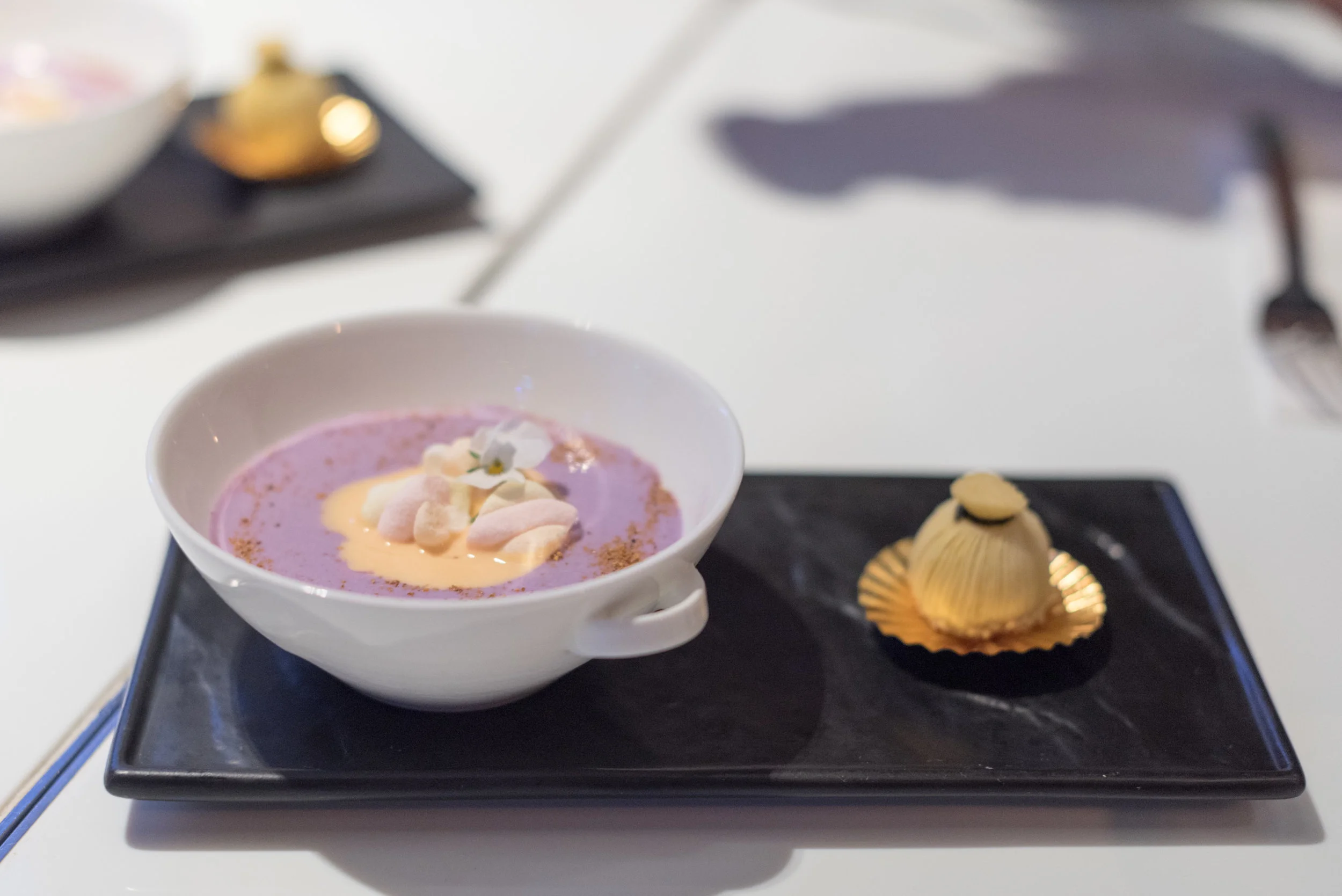 Dual Cream of Sweet Potato served with Golden Pineapple Bag 天降金袋 “旺” 来双薯桂花露